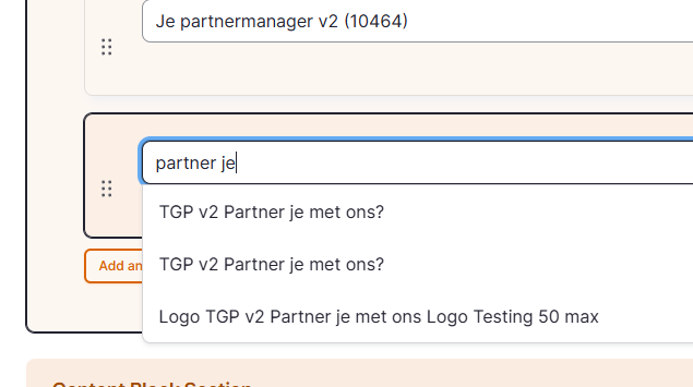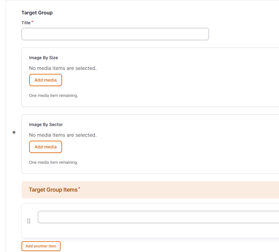 - Under Target Group Items, Type the title of the Target Group Items you want to show in the paragraph of the homepage. Suggestions will appear as soon as you start typing. Click to select the Target Group Item you want. To add another Target Group Item, click on Add Another Item.