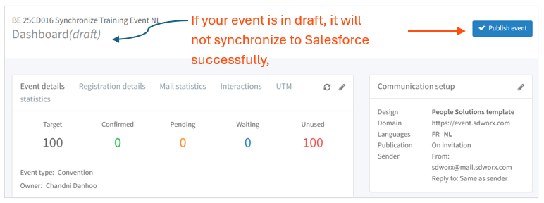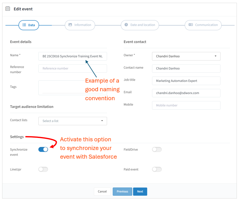 Toggle “Synchronize event” to activate Salesforce synchronisation. Before you do this, ensure you have used the correct naming convention: This is important because the Salesforce child campaign will inherit this exact name.
