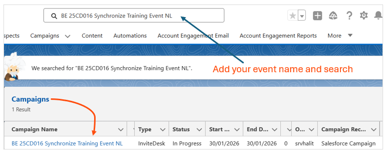 - Use a proper naming convention for your InviteDesk event (Example: BE 25CD016 Spark Event NL): The child campaign created in Salesforce will automatically use exactly the same name as the event in InviteDesk. Using the correct naming convention ensures consistency and proper reporting.