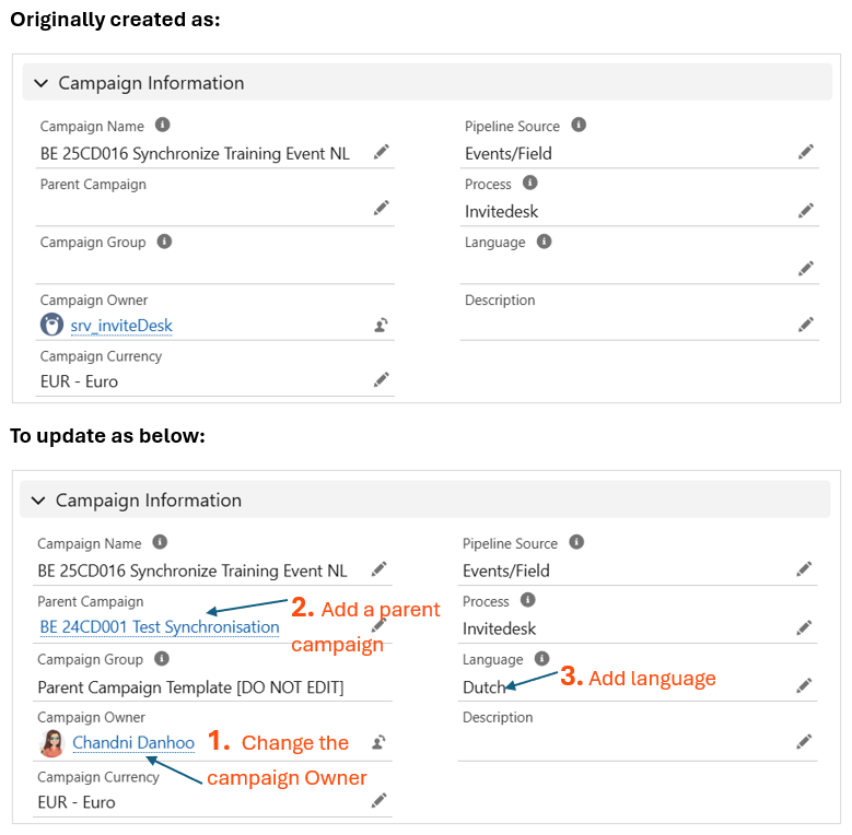 - Change the Campaign Owner from srv_inviteDesk to your own name. This is required before you can update the Parent Campaign field.